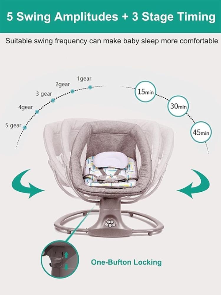 - 🔄 5 سرعات تأرجح قابلة للتعديل حسب راحة الطفل.